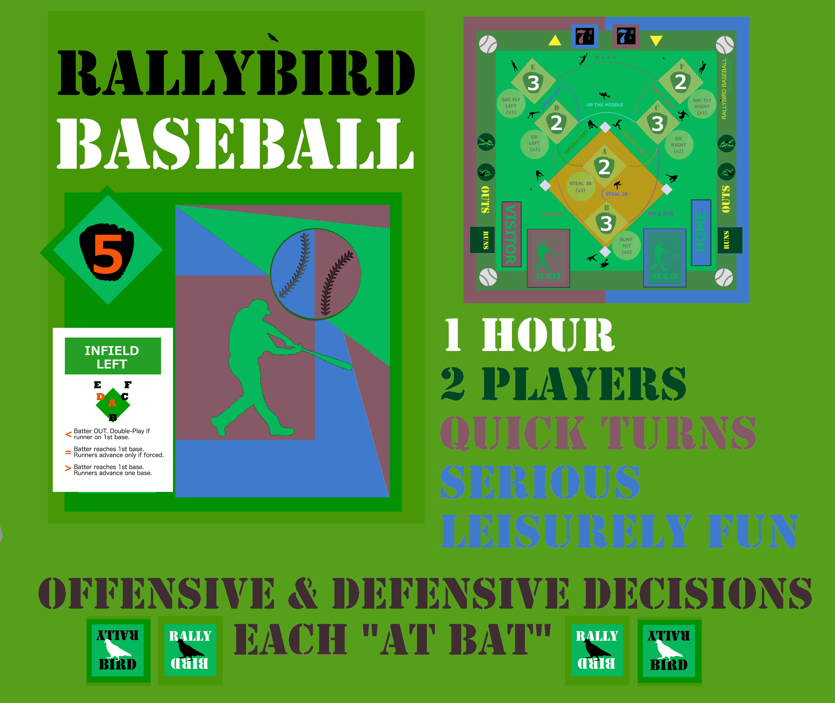 Rallybird Baseball–a 1 hour board game for 2 players. Offering quick turns, offensive & defensive decisions each “at Bat”, and serious leisurely fun!